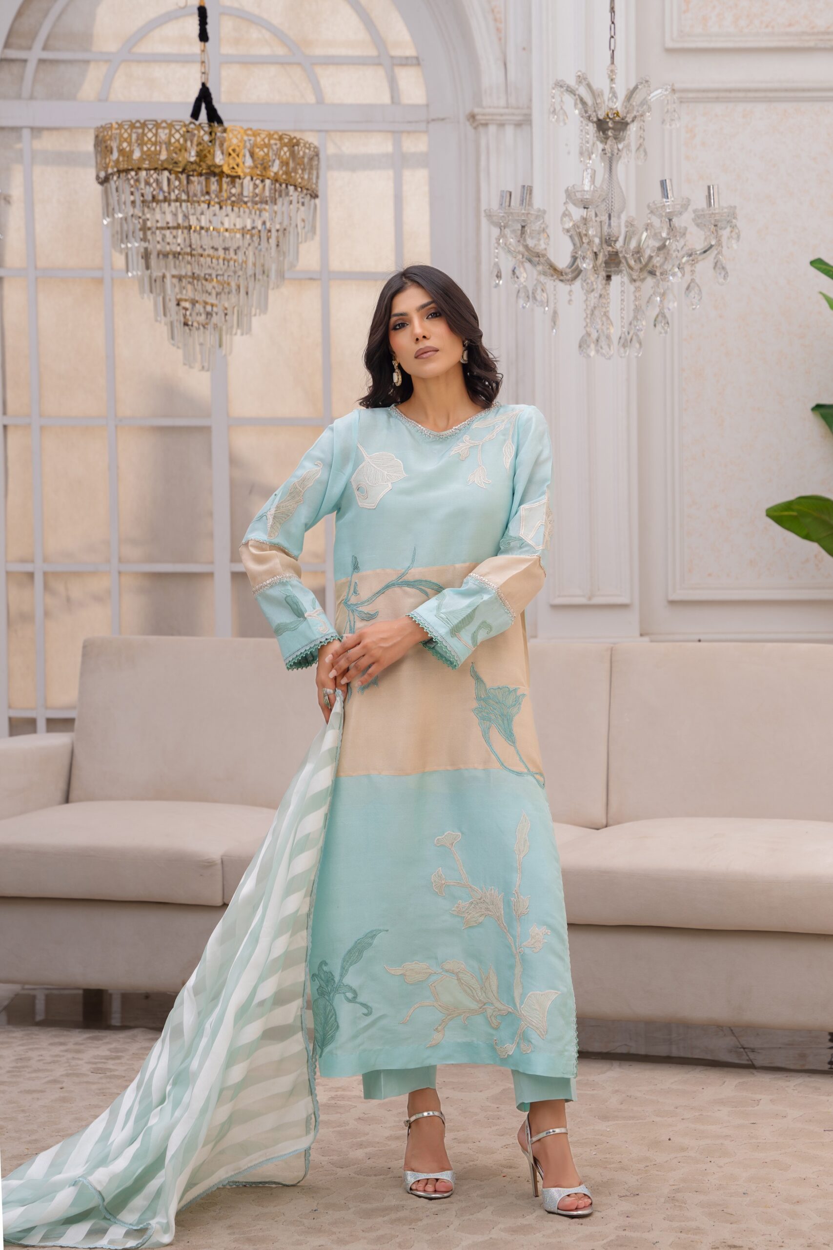 Be the first to review “Elegant Aqua Green & Silk Embroidered Dress – Ro Silk Fabric with Adha Work Detailing”